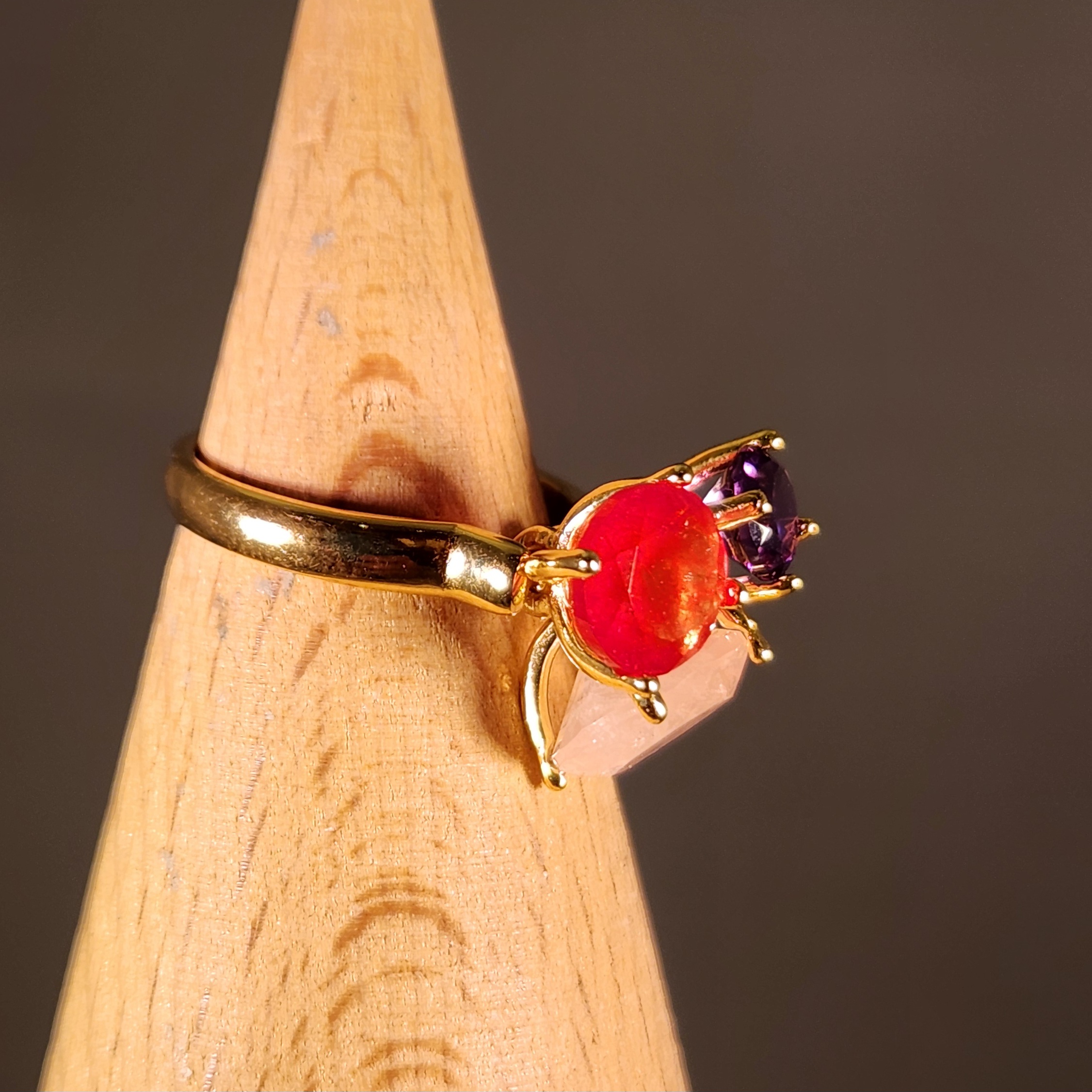 ローズクオーツ、アメジスト、赤翡翠で出来たリング ペンダントとしても使えます。