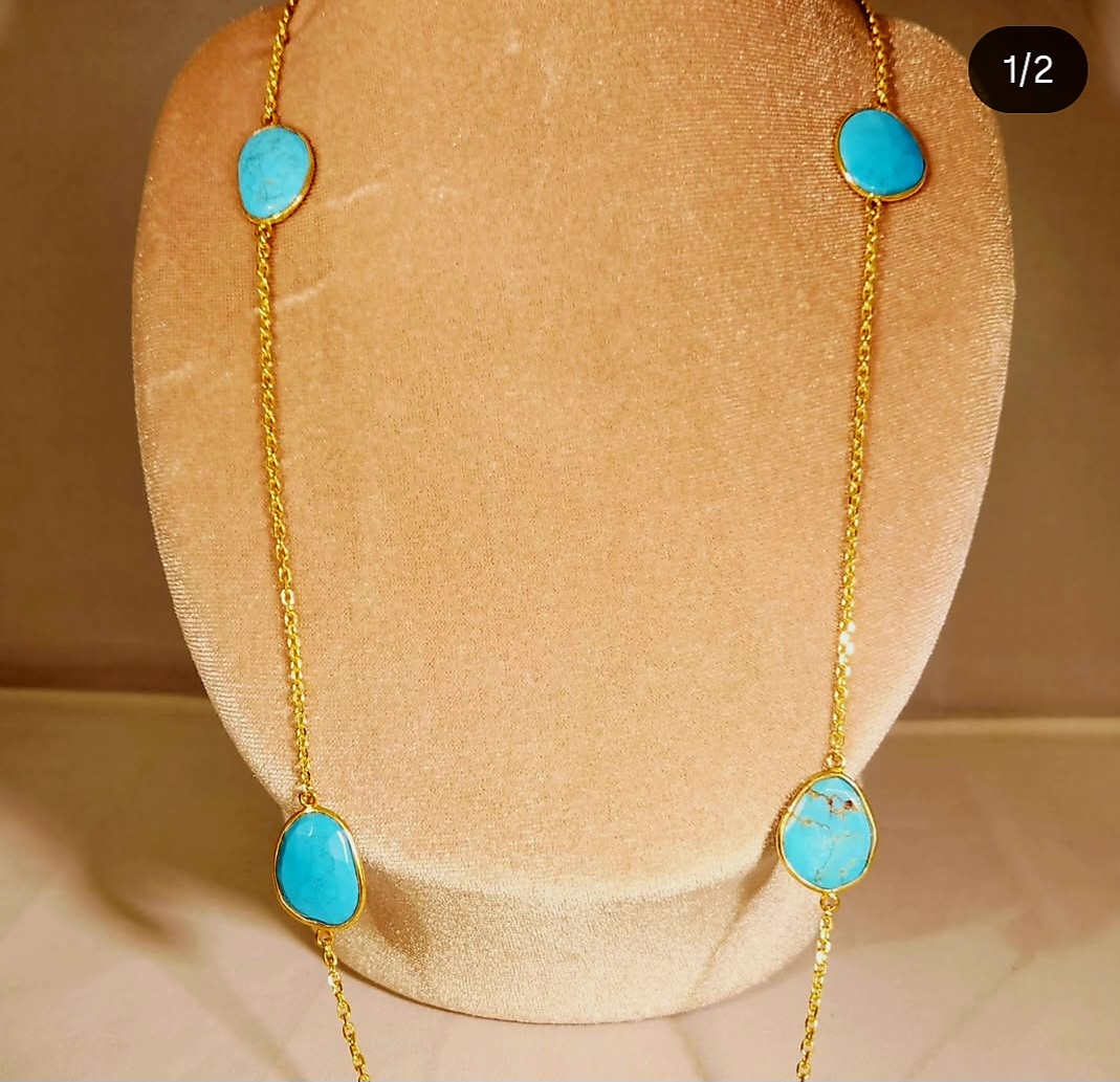 68cmの長さがあるターコイズのステーションネックレスは頭から被れます。 近年練り物(トルコ石の粉末などを樹脂で固めたもの)のトルコ石が増える中、今回制作した天然トルコ石は大変希少です。 チェーン部分はシルバー925にK18の仕上げが施されています。