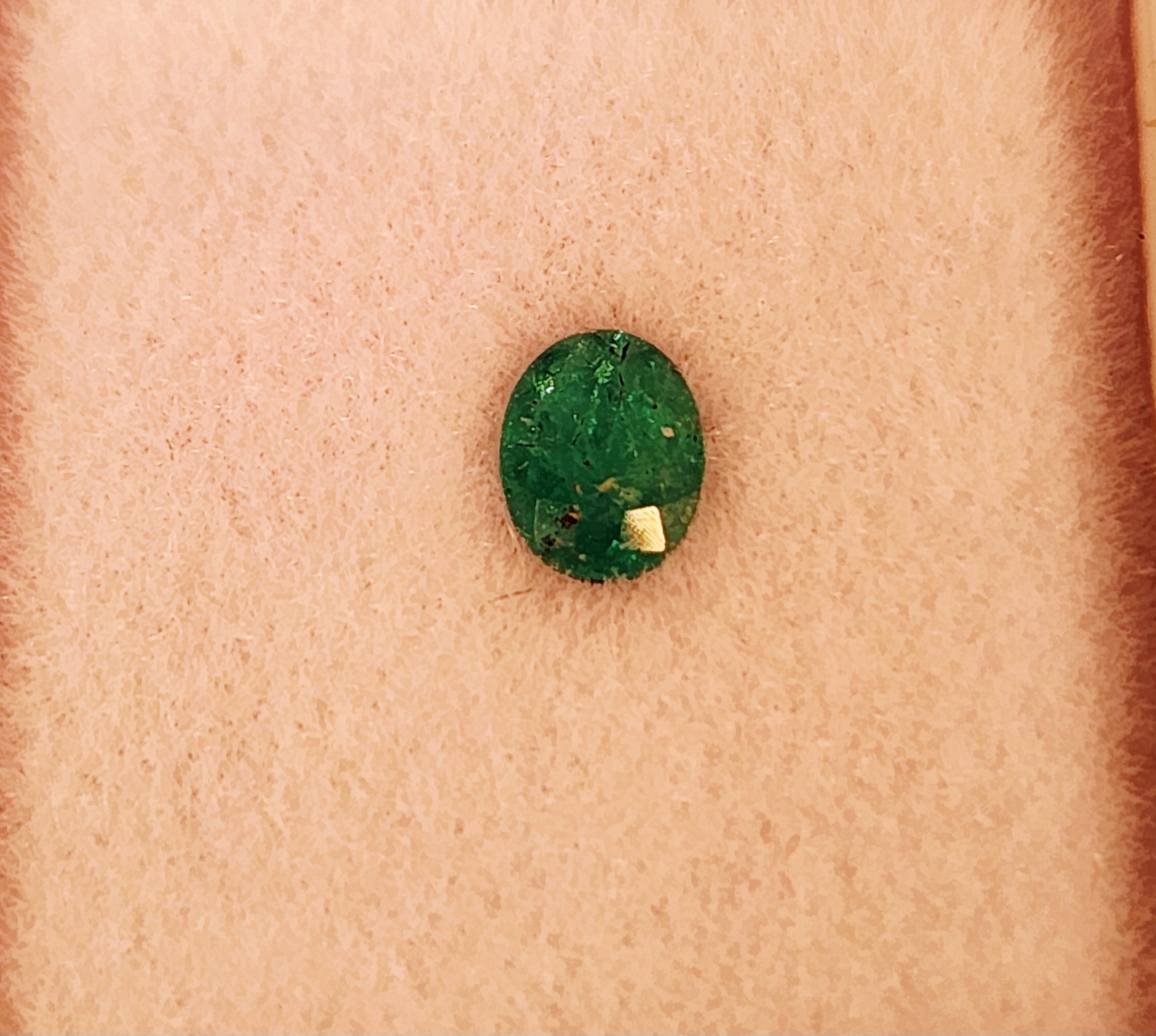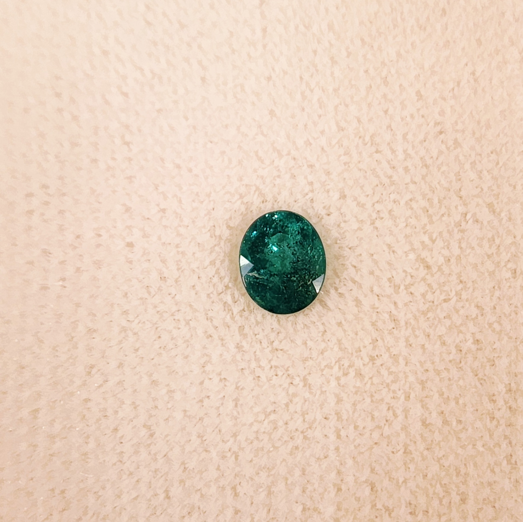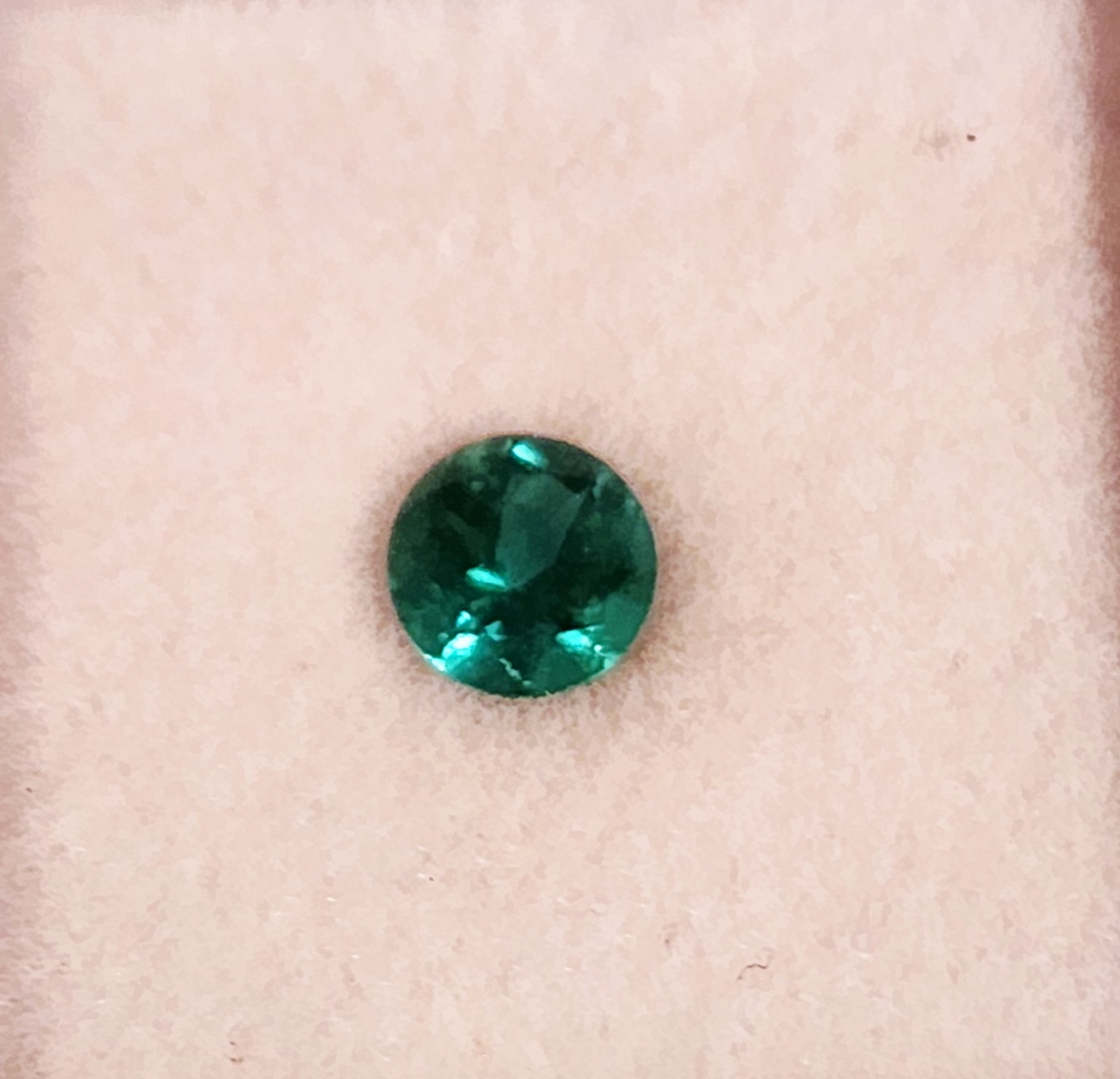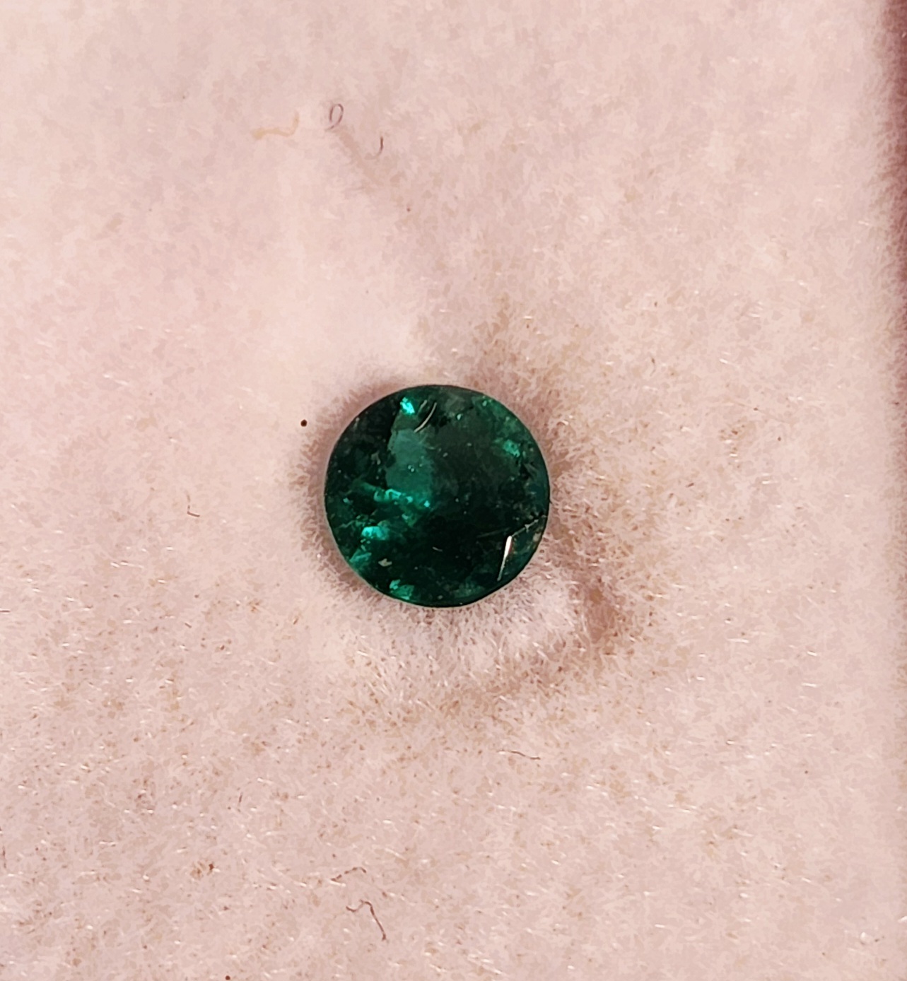 ラウンドの非常に照りの強いエメラルドです。ブラジル産ですが青みの強いコロンビア産の色目に非常に似ています。