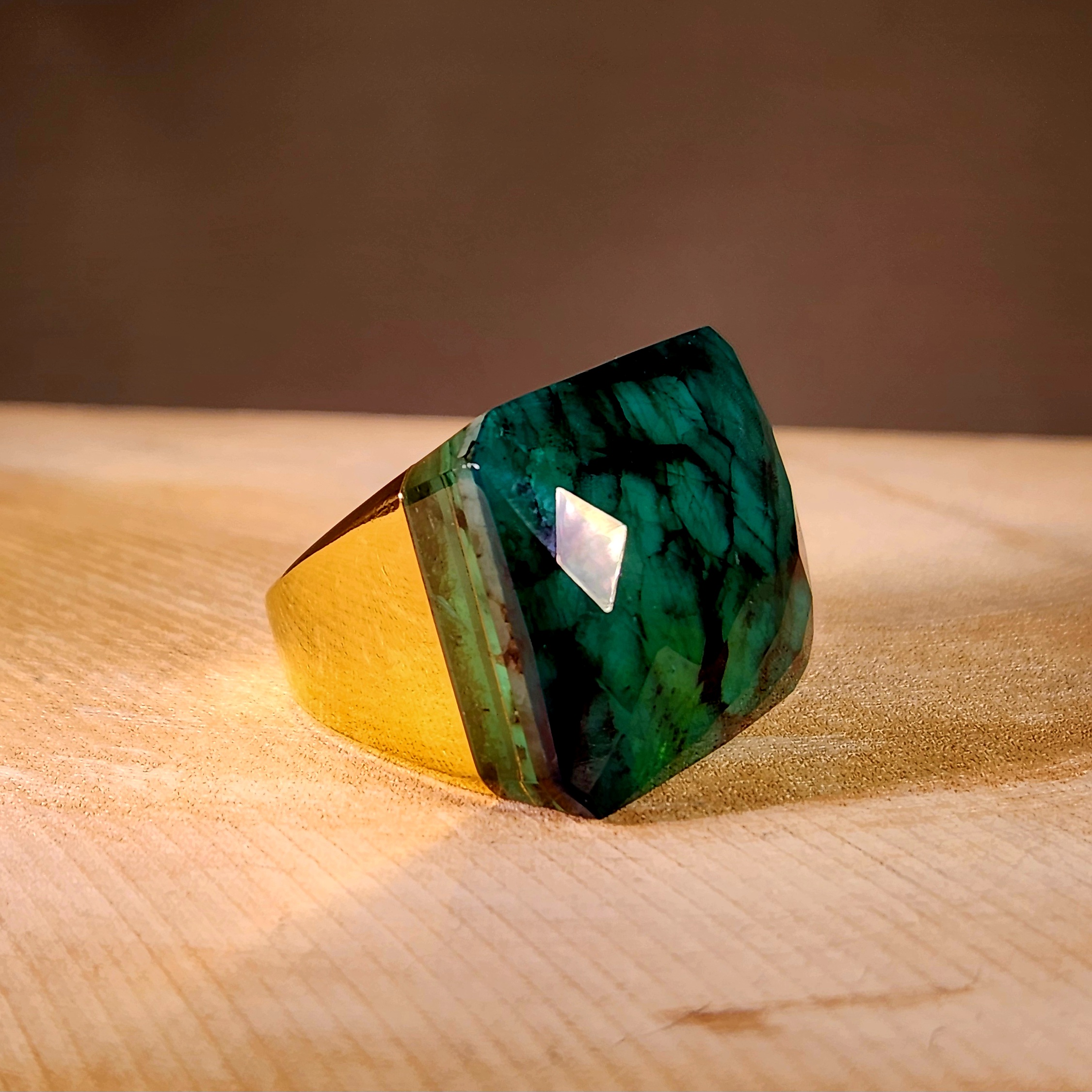 ブラジル産のエメラルドの原石を使用したシルバーリング、柔らかい原石を保護するため表面にはカットされた水晶を使用、ダブレット構造に成っています。