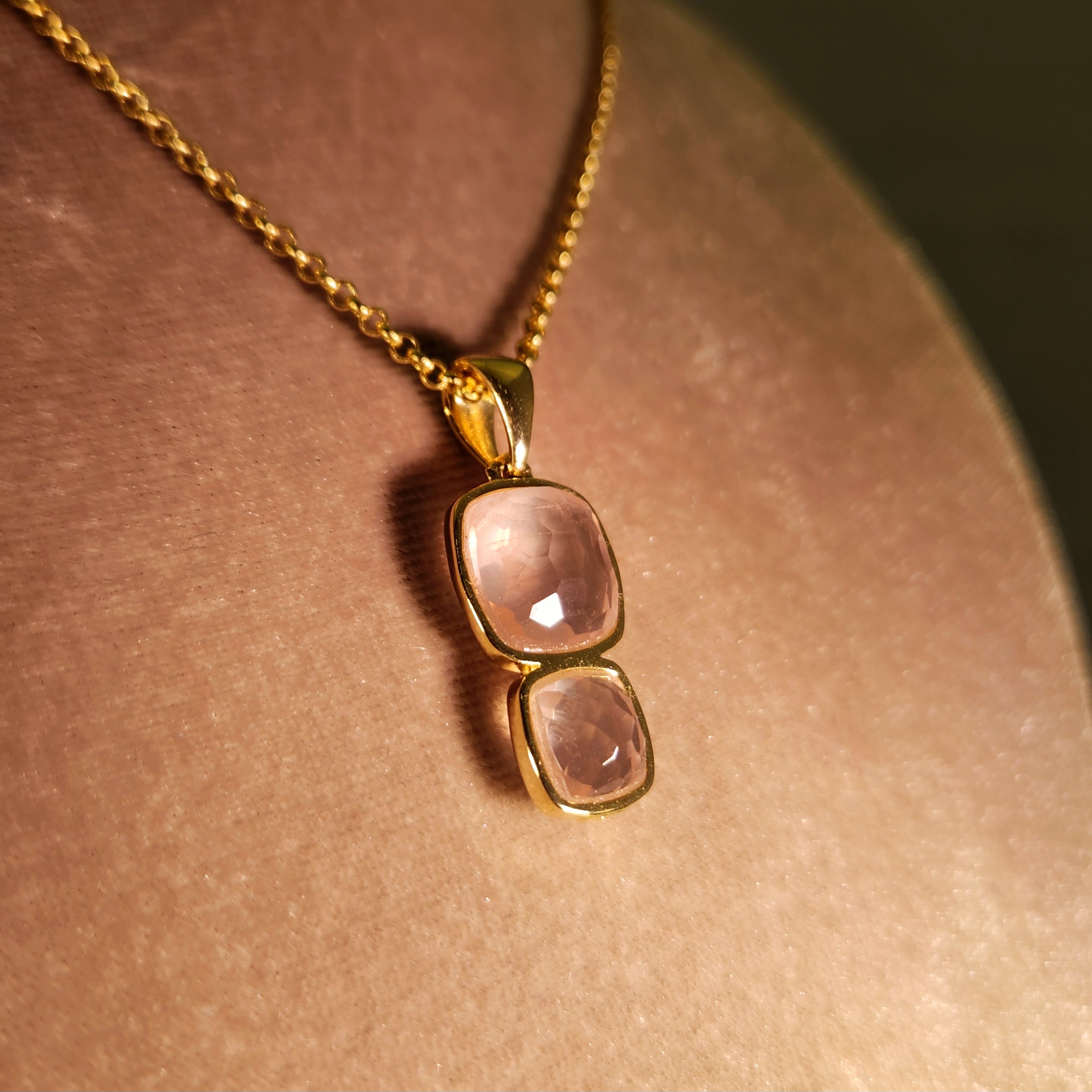 人気のローズクオーツ(恋愛運を高める石)を2石使用したペンダント両面カットのブリオレタイプで裏表がありません 45cmのサービスチェーン付 ブラス+k18p