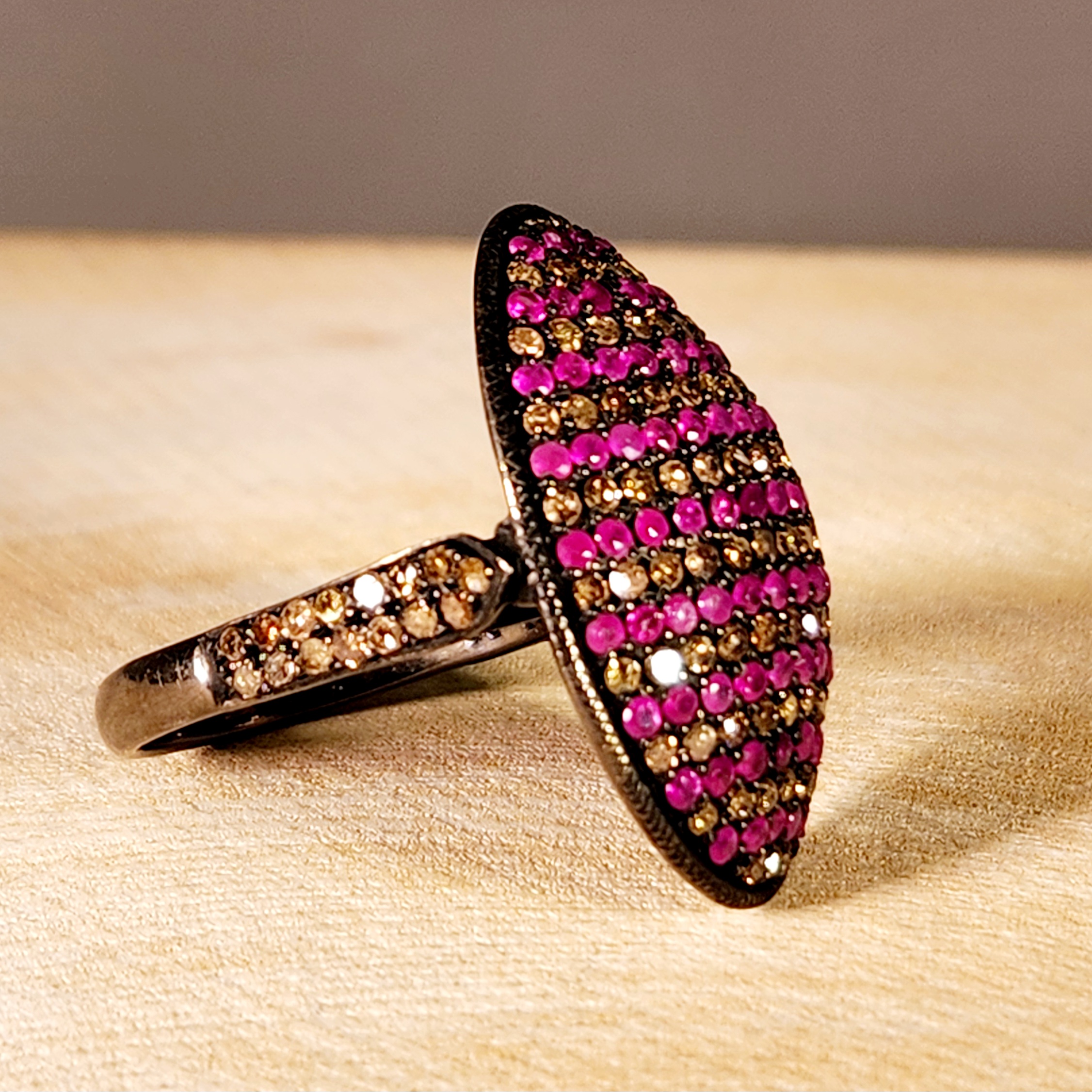 綺麗なルビ-とブラウンダイヤメレーで出来た925シルバーリング 表面にはブラックロジウムが掛かり渋めの仕上がりです。 925sv/ブラックロジウム 26x18mm