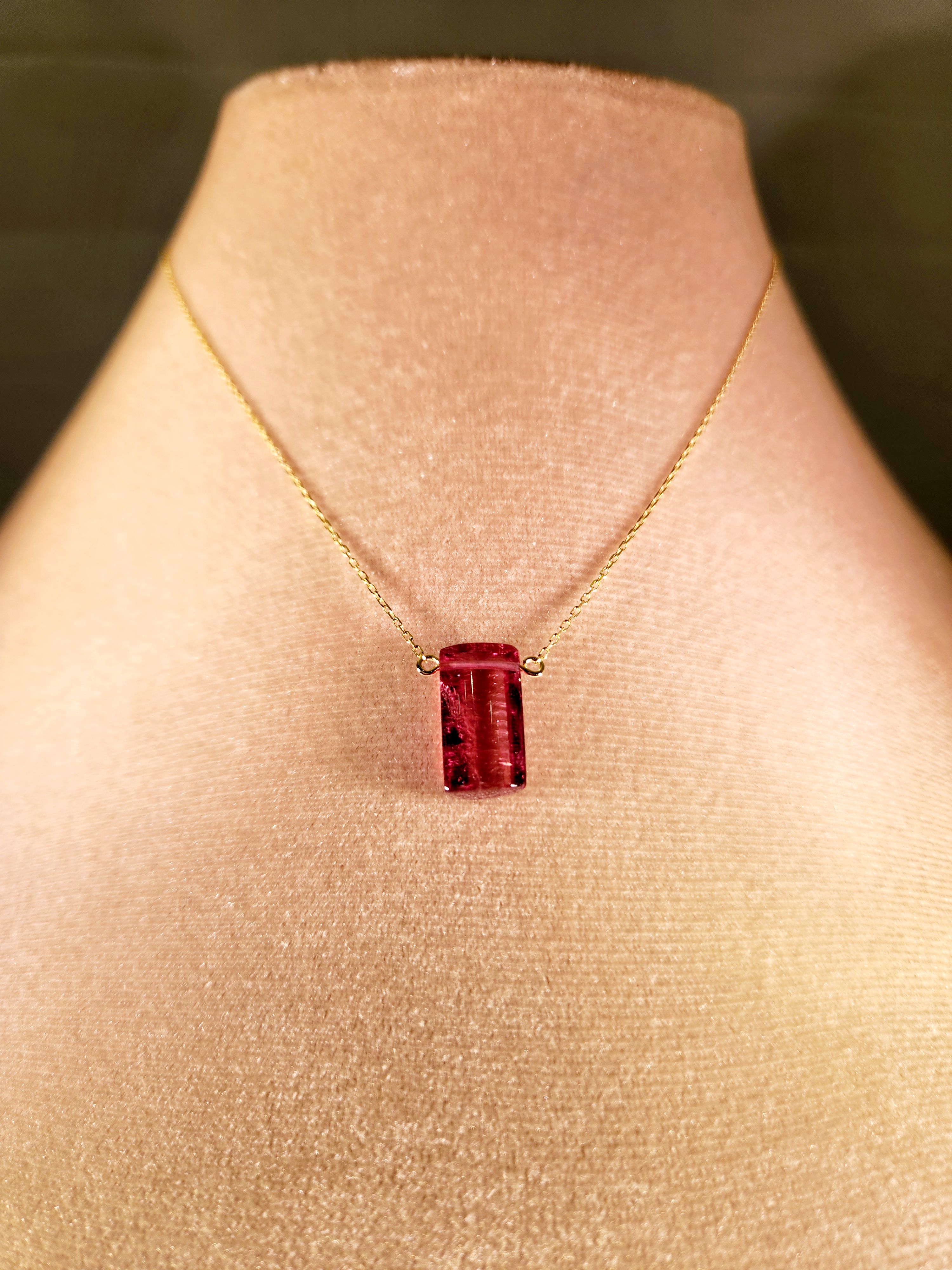 大変綺麗なピンクトルマリンのルースに穴を開け枠を作らずにペンダントに制作致しました。 テーブル面と裏側キューレット部分を前に持ってくることも出来ます。 ナチュラルな自然の石の雰囲気を楽しむことが出来ます。 チーンは45cm/K18