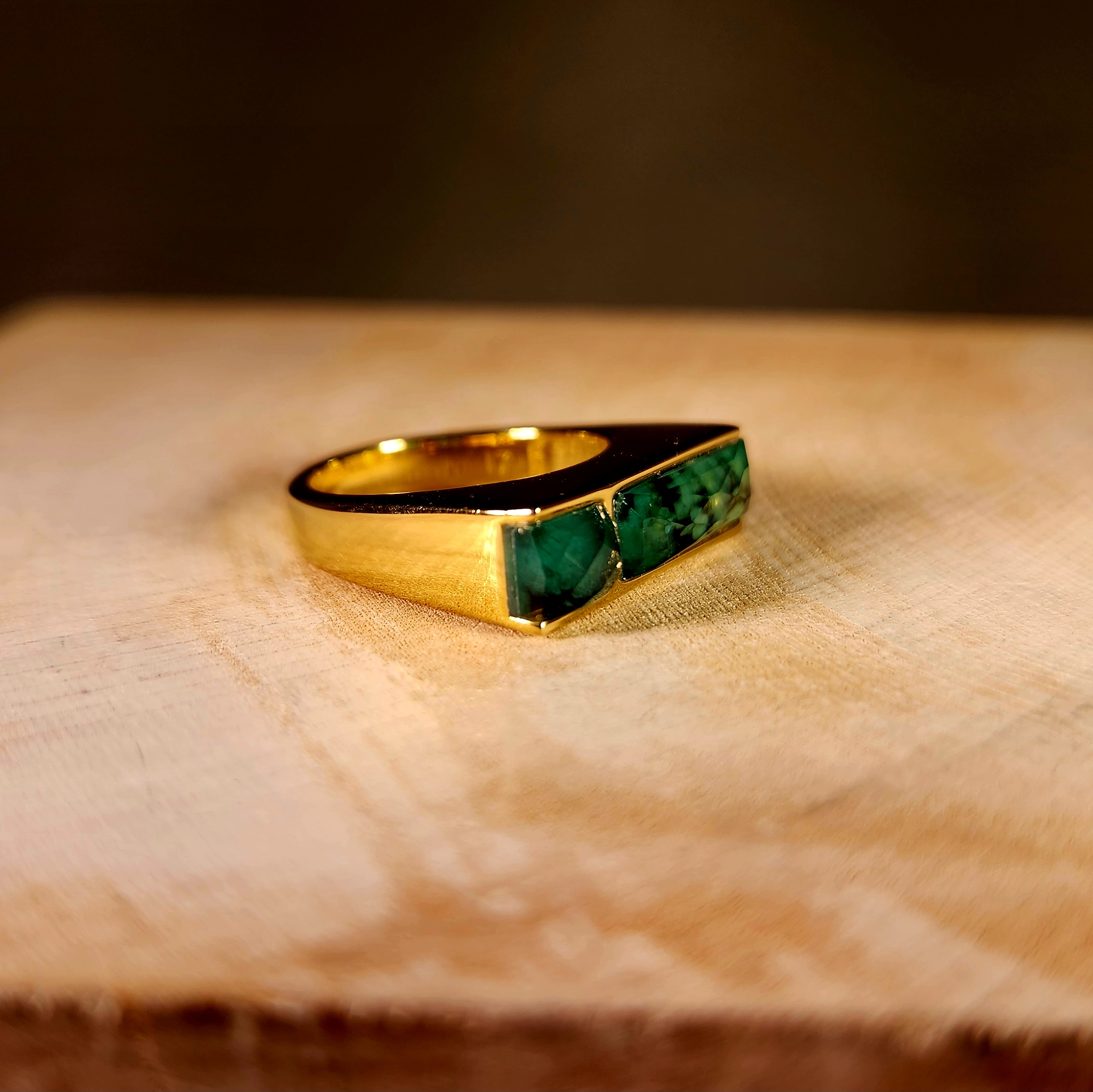 二つのエメラルドをレール留めしたリング、ストレートでモダンな都会的な雰囲気です。エメラルドは水晶とのダブレットになっています。
