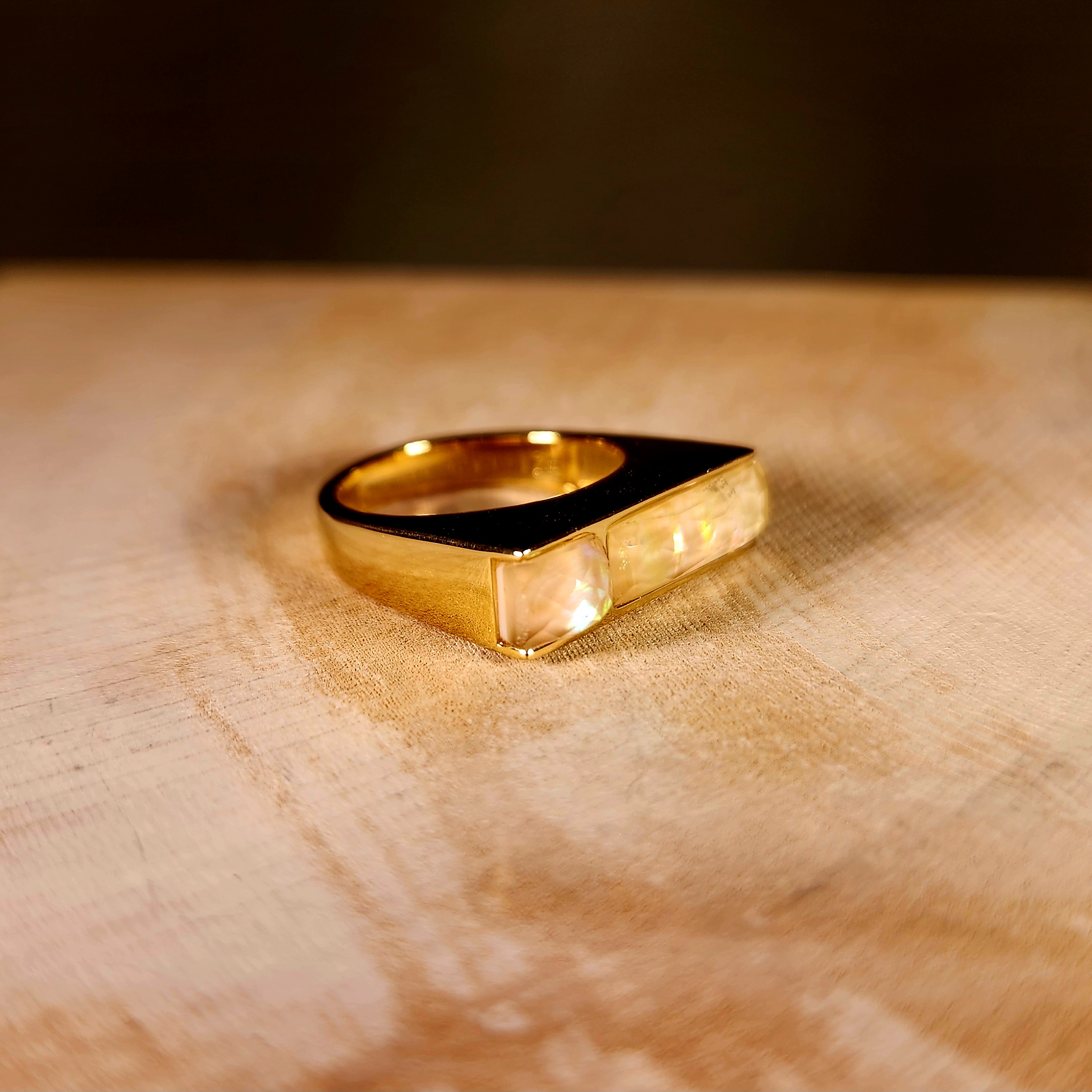 大人気の白蝶貝はどんなファッションにも合うジュエリーとして大変人気の石です。 ご紹介中のリングはベースに白蝶貝その上には水晶が使われています。