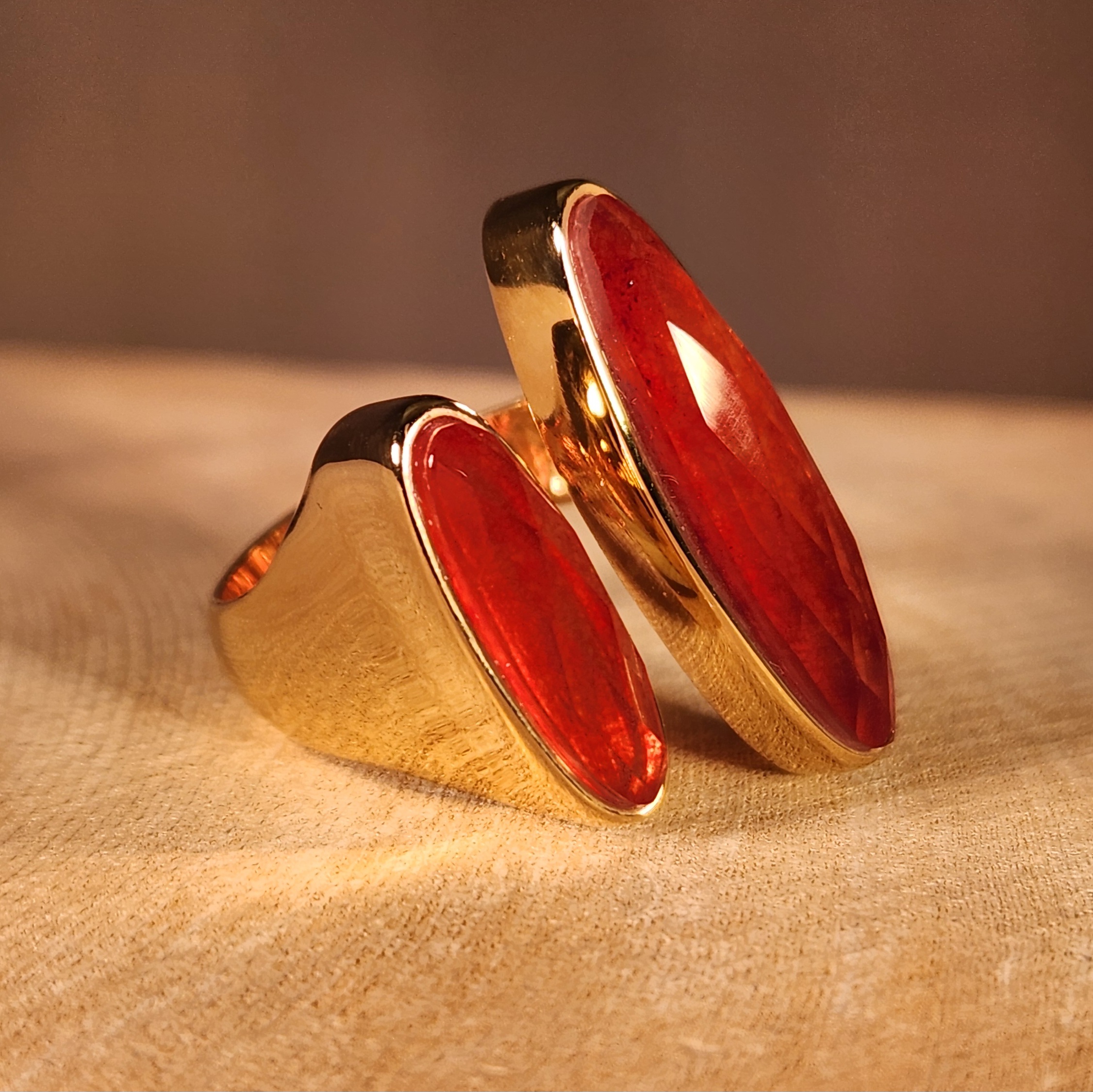 フリーサイズの2石使いのリングです。石は人気の赤翡翠を使用 縦長のフォルムのオーバルシェイプが指を美しく見せます。