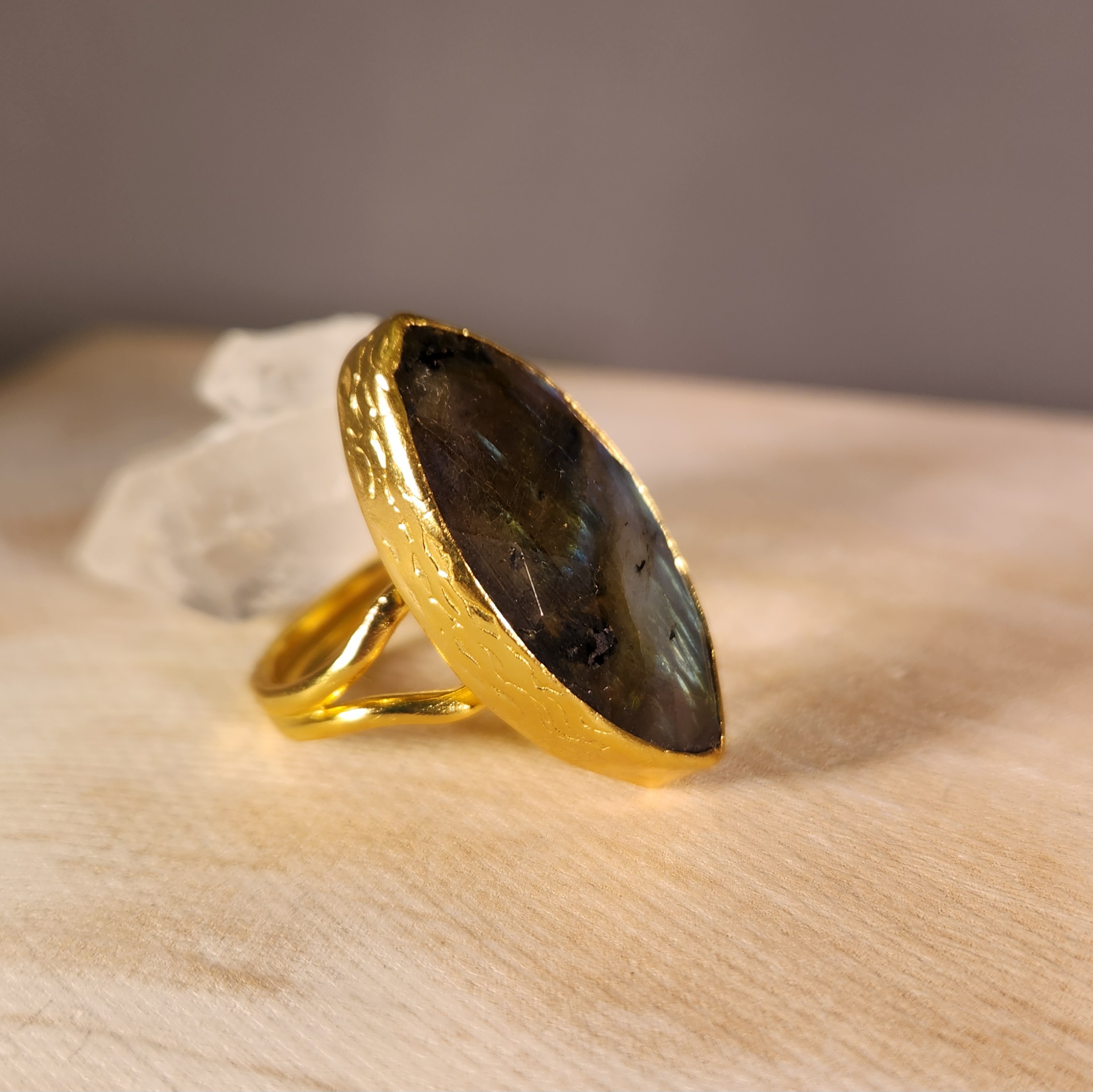 大振りのラブラドライトを使用したリング、シックな色合いはファッション的にもお勧めです。 この石はカナダラブラド地方で発見されこの名前が付きました。 長石と呼ばれる宝石のグループに属しムーンストン、アンデシン、アマゾナイト、サンストーン等が仲間になります。 ラブラドレッセンスと呼ばれる遊色効果の様な怪しく光るのが特徴です。 精神を安定させ創造性を高める石です。