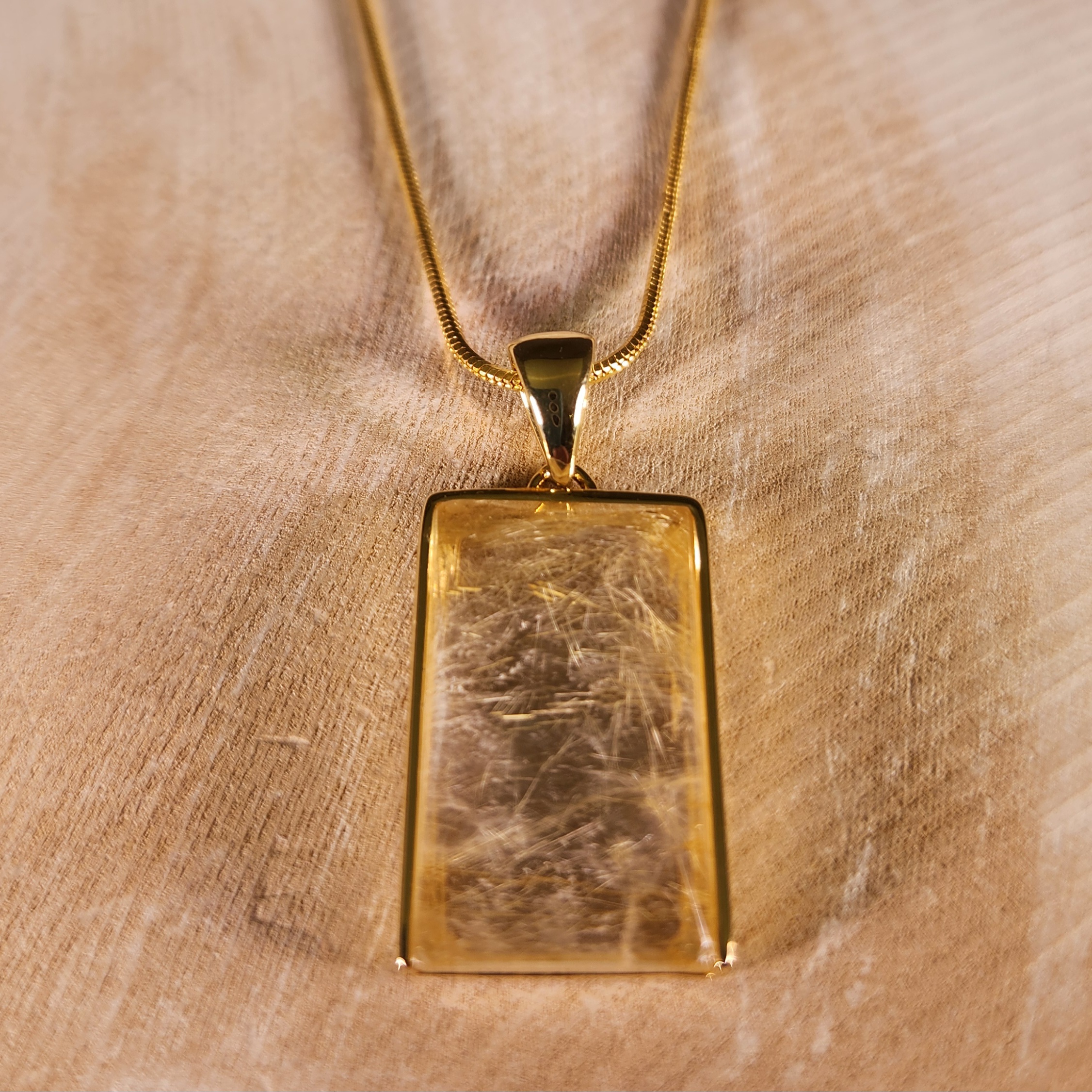 人気のルチルを使用したペンダント。風水では金運の石とも呼ばれています。黒の無地セーターなどに着用すると針状の内包物が浮き出て見えてきます。水晶の中にチタンなどの針状結晶が入っています。この内包物入り方は全て違います。
