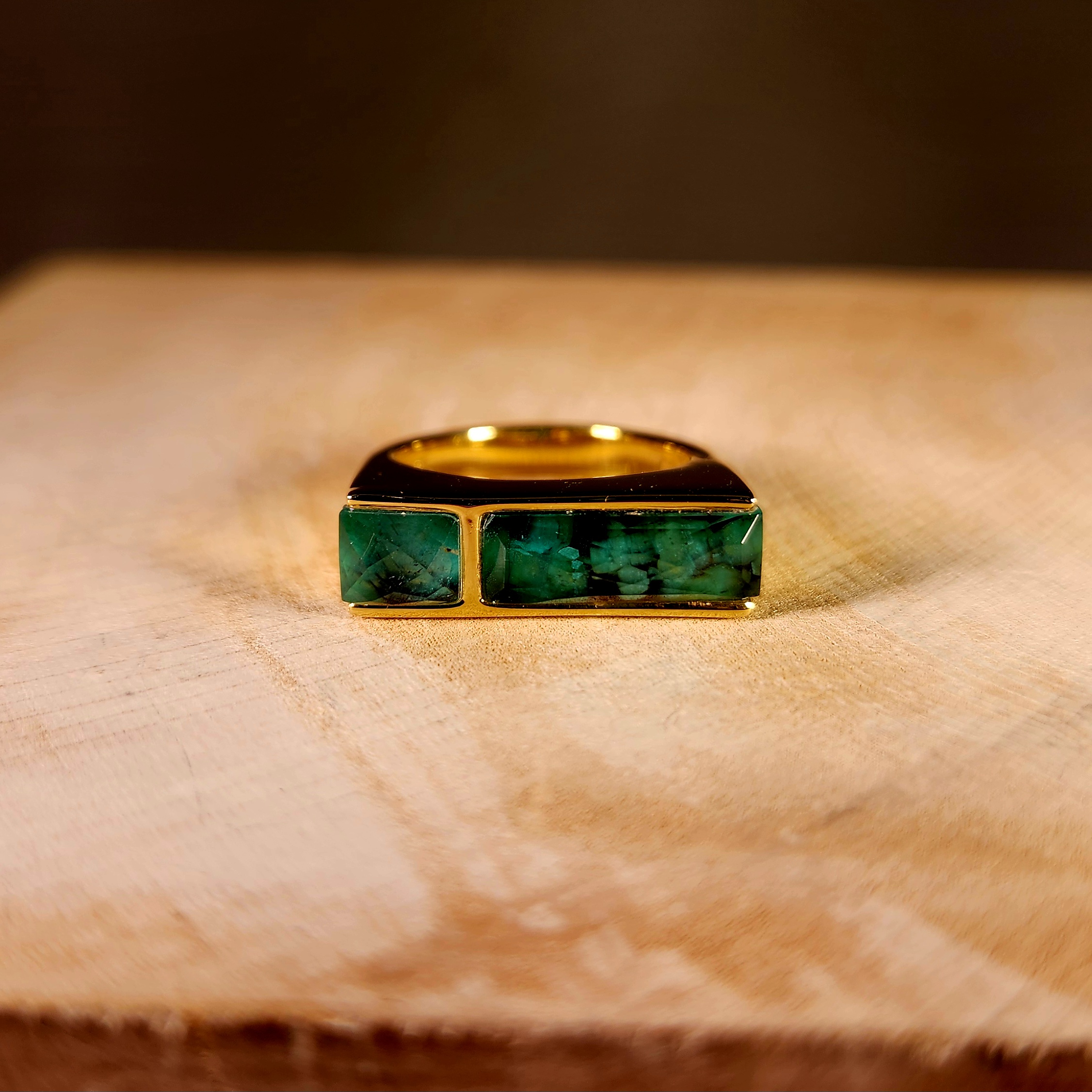 二つのエメラルドをレール留めしたリング、ストレートでモダンな都会的な雰囲気です。エメラルドは水晶とのダブレットになっています。