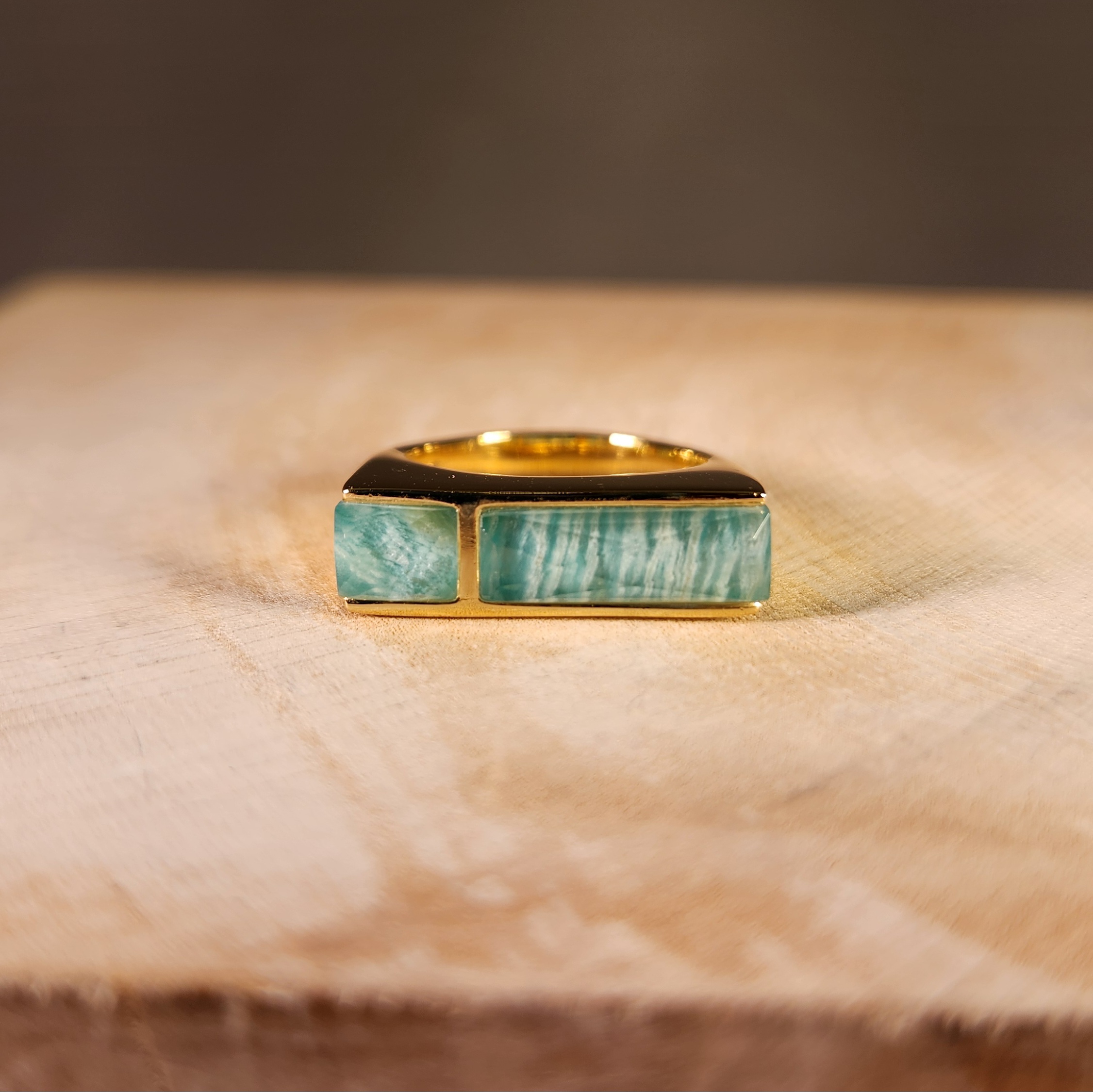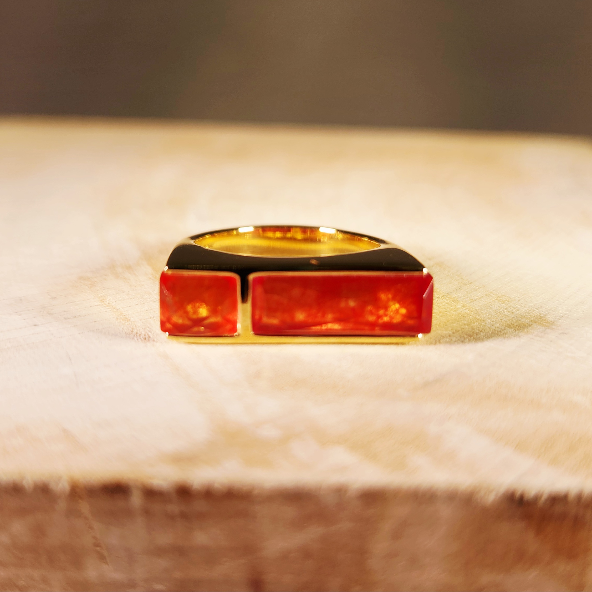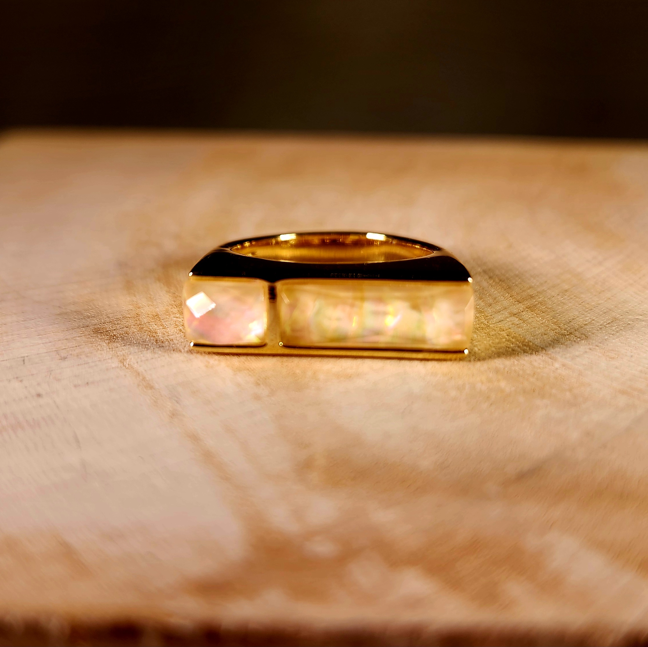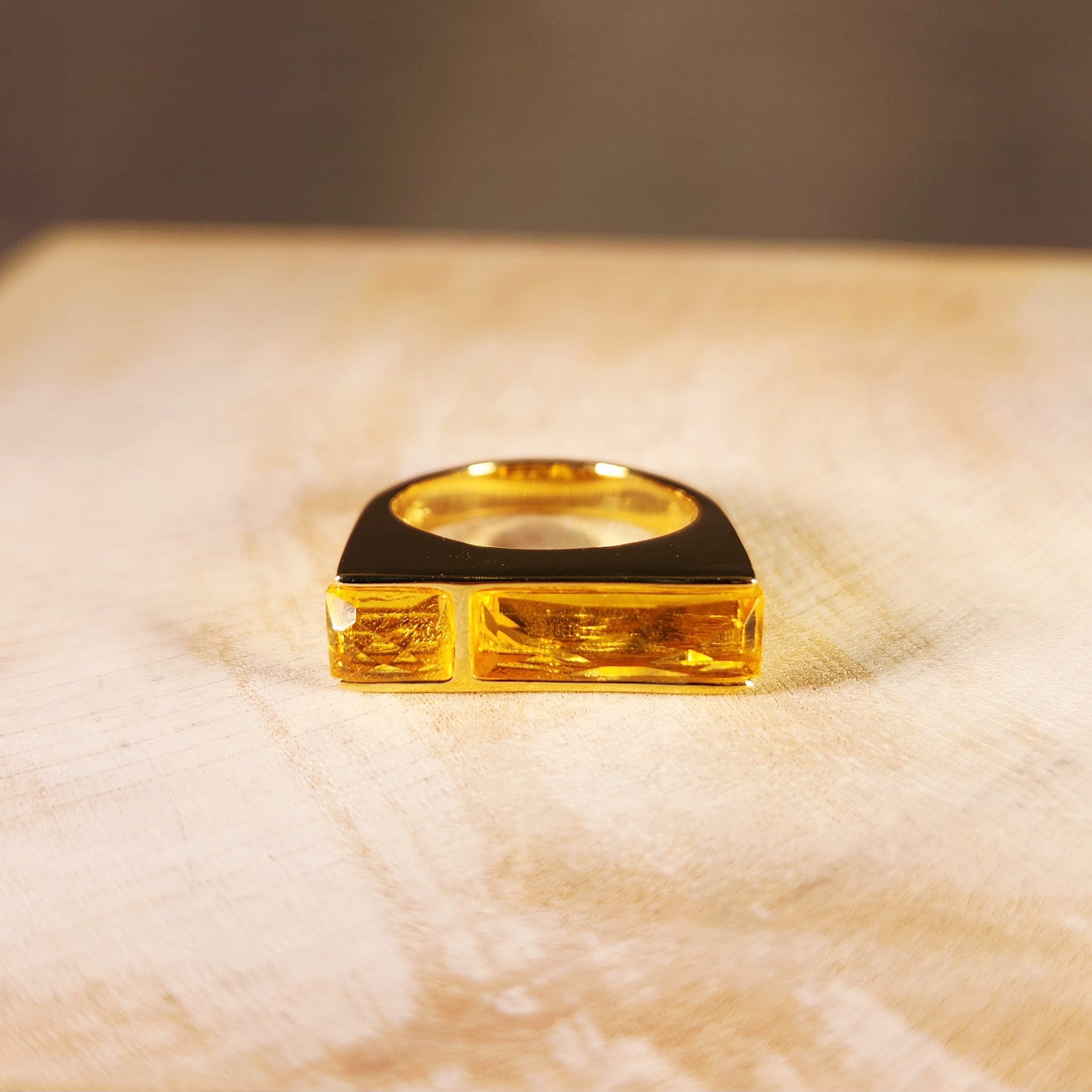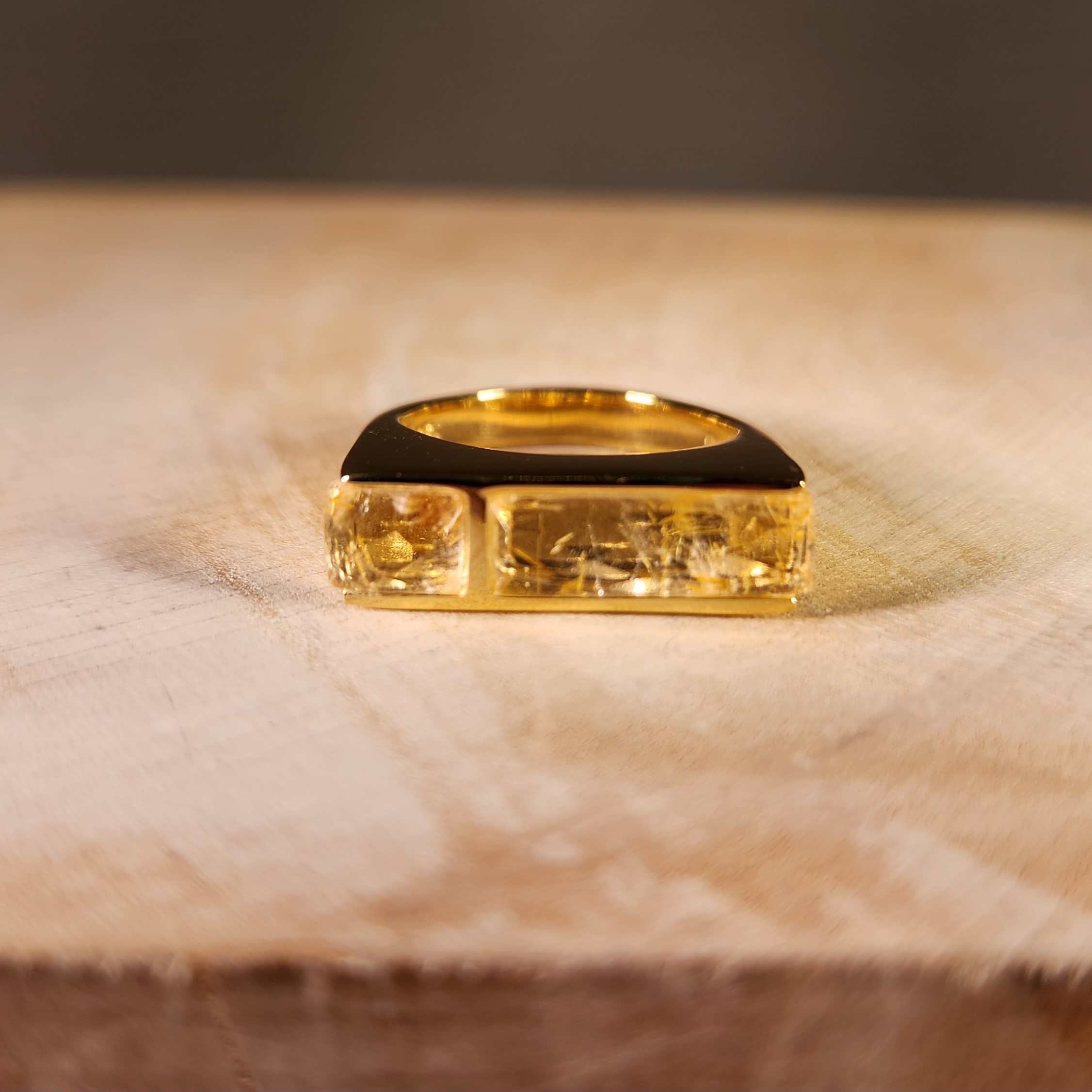 人気のカラーストンのルチルを使用した都会的なデザインリング、レール状のデザインに2つの石がセットされています。