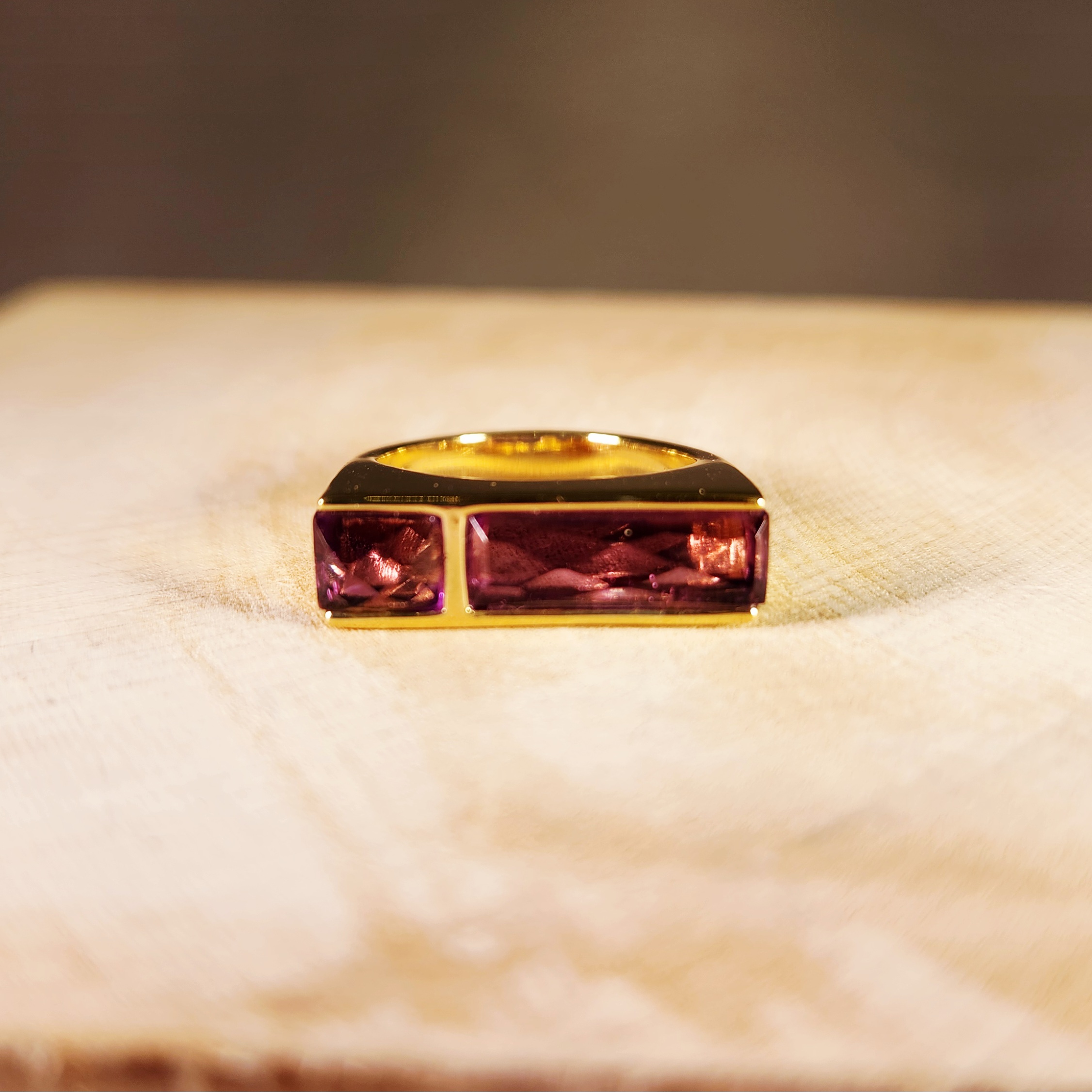 シックなアメジストを使用したモダンなリング、大小の2つの石が留まります。