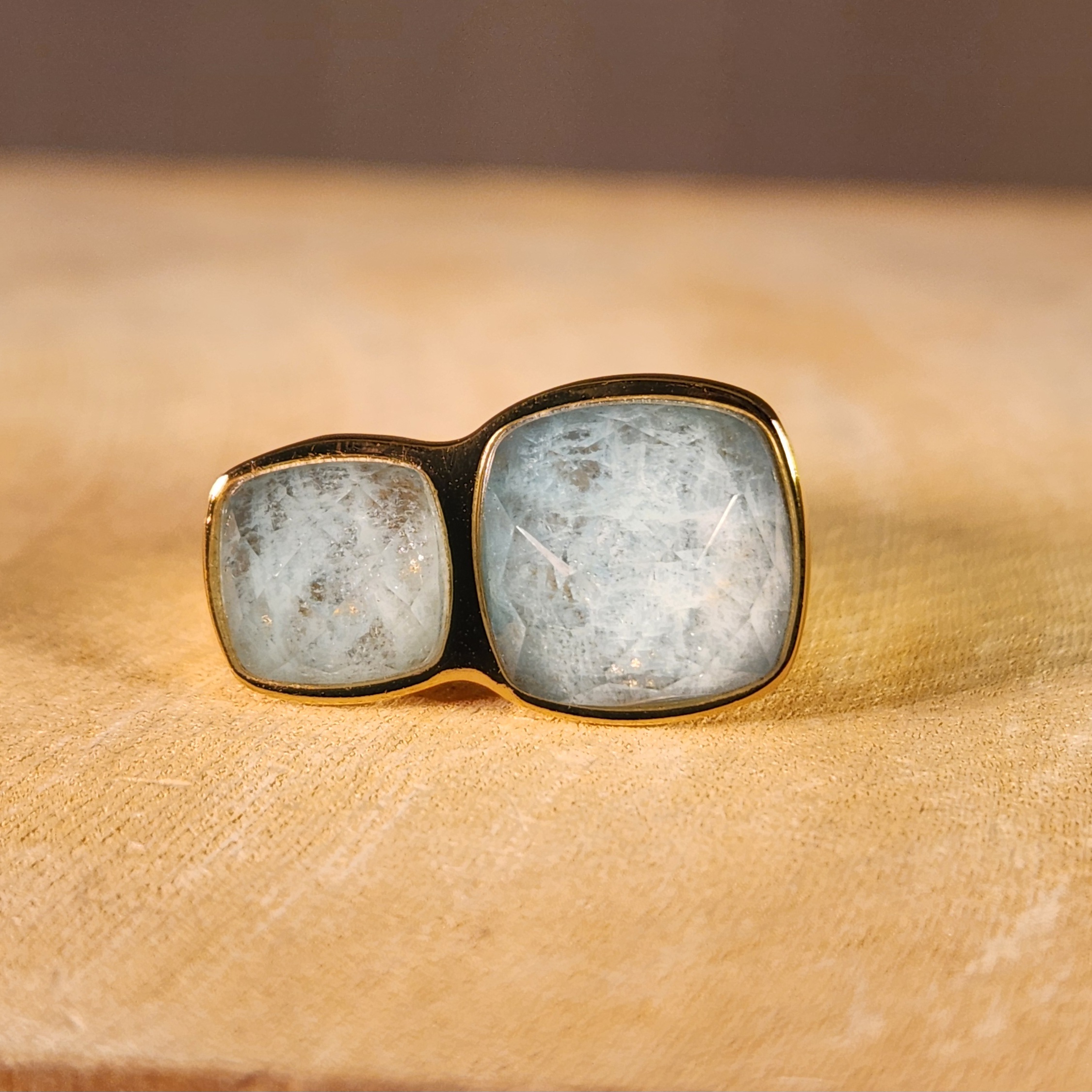 オーバル型大振りのアクアマリンリング緩やかなカボションにチェスカットが入ります。