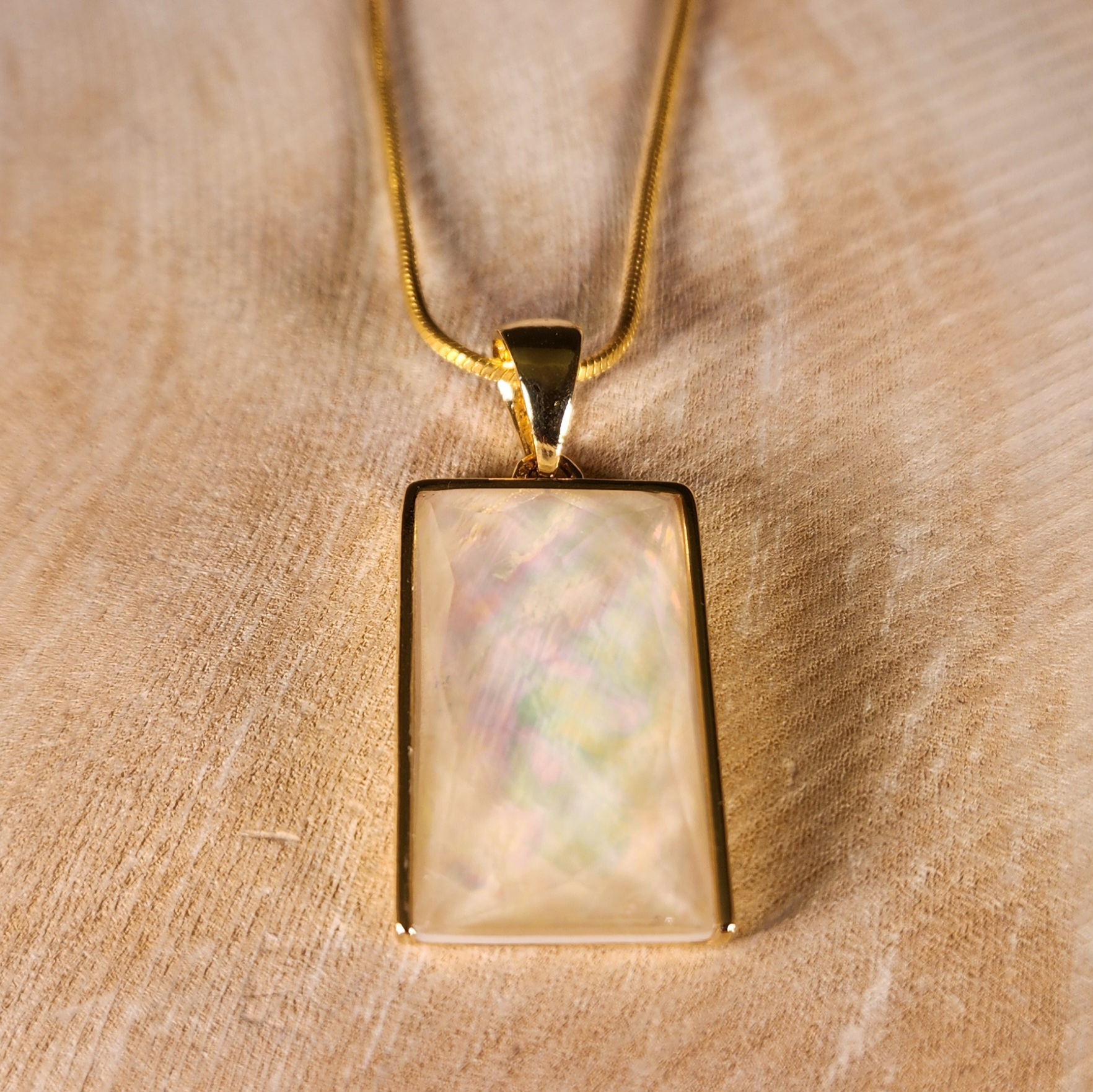 シンプルな白蝶貝のペンダントは水晶と合わせたダブレットになっています。